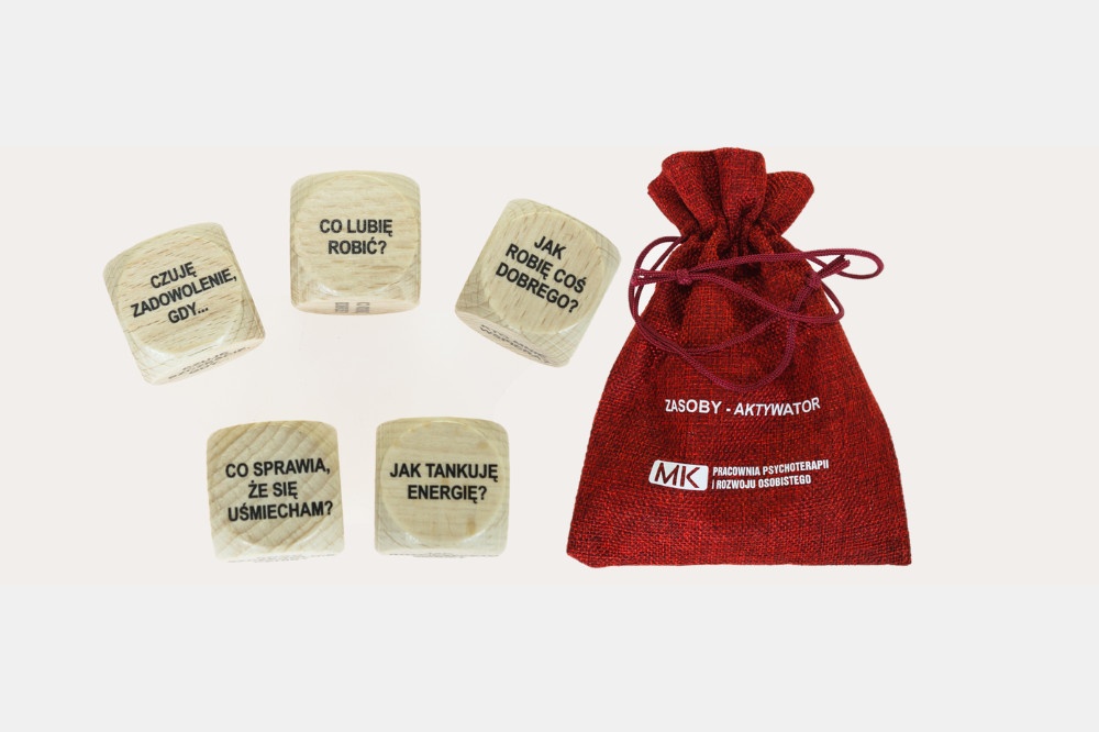 Zestaw składa się z pięciu dużych drewnianych kostek z pytaniami i zdaniami do uzupełnienia, które zachęcają do refleksji. Gra jest prosta w użyciu – uczestnik rzuca kostką i odpowiada na wylosowane pytanie, albo kończy zdanie, co stymuluje jego kreatywne myślenie i samopoznanie. Instrukcja PDF dołączona do zestawu zawiera szczegółowe wskazówki i ćwiczenia, które ułatwiają pracę z narzędziem.